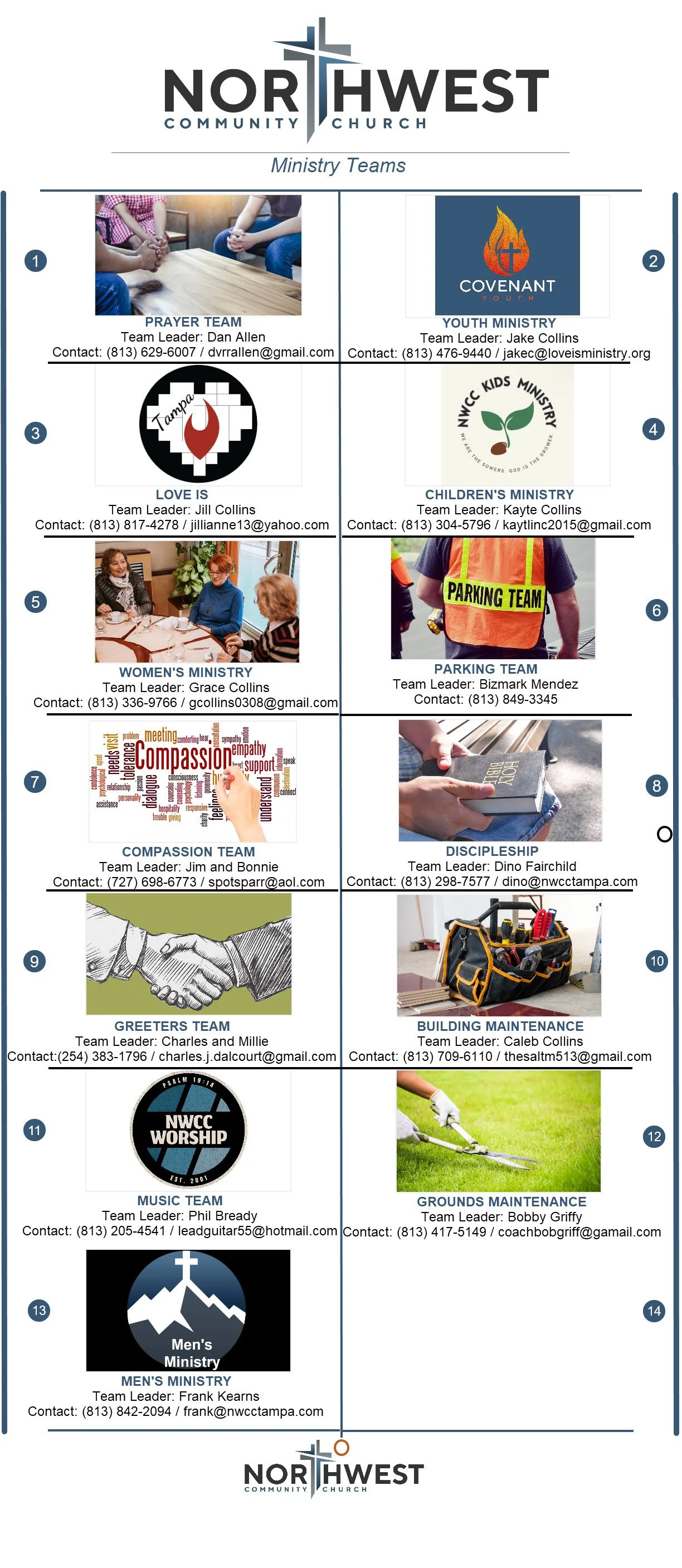 Ministry Teams exist to assist with the ministry needs of the church. These teams are made up of volunteers who have a passion for a specific area of ministry. If you are looking for a way to step in and help with the ministries of our church one or more of these teams is just the place for you.
